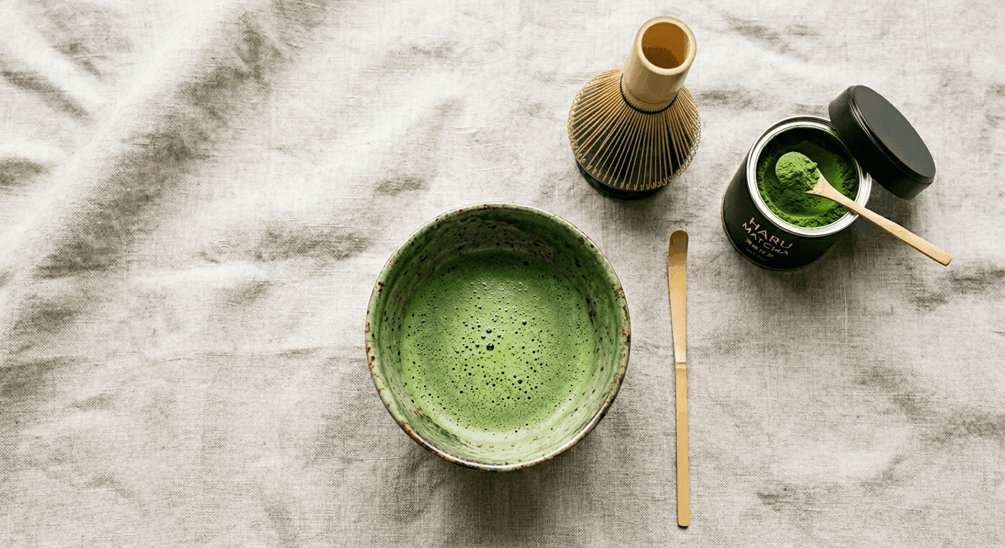 Tout pour commencer : matcha cérémoniel + chasen + chawan + guide. Cadeau idéal.